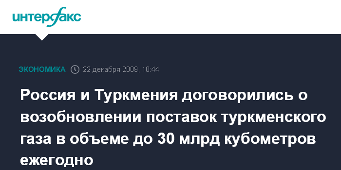 Москва. 22 декабря. INTERFAX.RU – Россия и Туркмения договорились о возобновлении поставок туркменского газа в период с 1 по 10 января 2010 года в объеме до 30 млрд кубометров ежегодно.