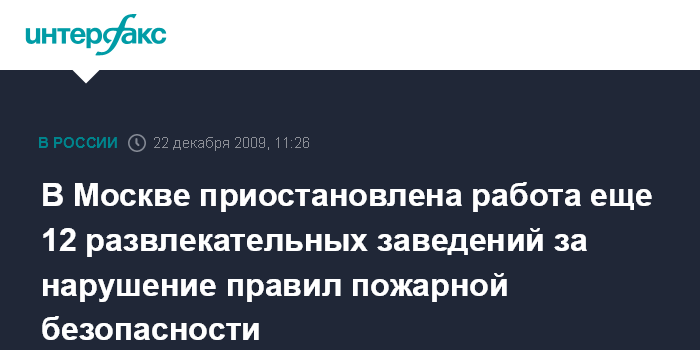 Москва. 22 декабря. INTERFAX.RU – В столице судебными решениями приостановлена деятельность еще 12 ресторанов, клубов и других учреждений досуга из-за нарушений правил пожарной безопасности, сообщили "Интерфаксу" в пресс-службе ГУ МЧС по Москве во вторник.
