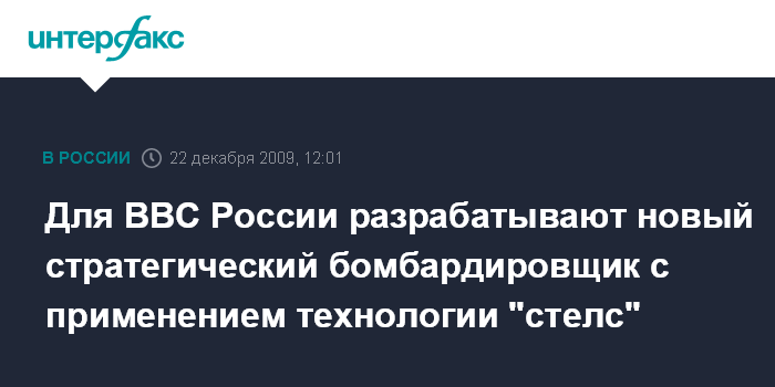 Москва. 22 декабря. INTERFAX.RU – В России разрабатывается новый стратегический бомбардировщиков с применением технологий "стэлс", сообщил журналистам командующий Дальней (стратегической) авиации (ДА) генерал-майор Анатолий Жихарев.