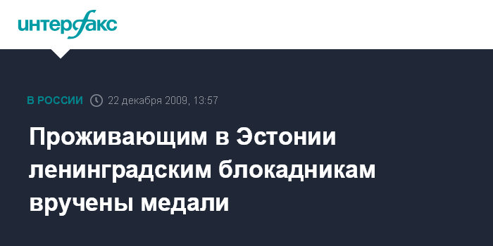 Москва. 22 декабря. INTERFAX.RU - В российском посольстве в Таллине во вторник состоялась торжественная церемония вручения проживающим в Эстонии бывшим ленинградским блокадникам медали "В честь 65-летия полного освобождения Ленинграда от фашистской блокады". Хочу поблагодарить вас за подвиг, совершенный во имя жизни и победы в годы войны, поздравить с наступающими праздниками, а также отметить, что в таком торжественном стиле мы уже сегодня начинаем подготовку к празднованию 65-летию победы в Великой Отечественной войне", - сказал посол РФ в Эстонии Николай Успенский.