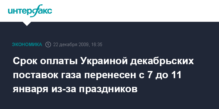 Москва. 22 декабря. INTERFAX.RU - Дата оплаты декабрьских поставок газа "Нафтогазом Украины" перенесена с 7 на 11 января 2010 г. с учетом нерабочих праздничных дней, сообщила пресс-служба "Газпрома". Кроме того, на состоявшейся во вторник в Москве встрече главы "Газпрома" Алексея Миллера с председателем правления "Нафтогаза" Олегом Дубиной обсуждались вопросы, связанные с объемами поставок и транзита газа в I квартале 2010 года.