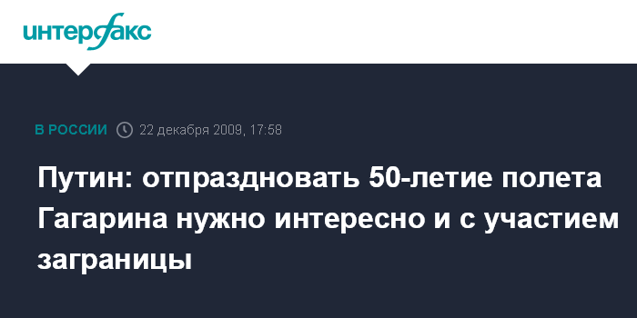 Москва. 22 декабря. INTERFAX.RU - Премьер-министр РФ Владимир Путин призвал правительство и региональные власти без формализма подойти к подготовке к празднованию в 2011 году 50-летия первого полета человека в космос. "Нам не нужны чисто казенные, формальные торжества, важно задать верный, правильный тон, сделать предстоящий праздник по-настоящему интересным для людей как в России, так и за рубежом", - сказал Путин, открывая во вторник заседание комитета по подготовке к этим торжествам. При этом он подчеркнул, что "полет Гагарина - это достижение всей цивилизации и поэтому серьезным направлением работы по подготовке празднования должна стать международная составляющая, к ней целесообразно привлекать росзагранучреждения и соотечественников за рубежом".