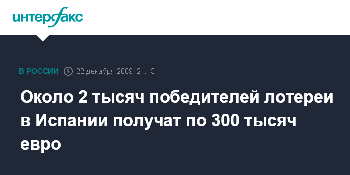 Москва. 22 декабря. INTERFAX.RU - Победителями лотереи "Эль Гордо", проводившейся в декабре 2009 г. в Испании, стали 1,950 тыс. человек, сообщает во вторник британский телеканал Sky News. Общий призовой фонд лотереи составил 2,32 млрд евро. Таким образом, каждый обладатель счастливого билета с выигрышным номером 78294 получит 300 тыс. евро.