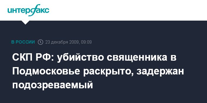 Москва. 23 декабря. INTERFAX.RU - Следственный комитет при прокуратуре РФ заявил о раскрытии убийства православного священника в Московской области. "В течение нескольких часов следователям во взаимодействии с оперативными сотрудниками милиции дерзкое преступление удалось раскрыть", - сообщил в среду "Интерфаксу" официальный представитель СКП Владимир Маркин. "Установлены обстоятельства убийства, подозреваемый и свидетели преступления. В качестве подозреваемого следствием задержан Олег Шехов, 1970 г.р., ранее уже судимый и отбывший срок за убийство", - сказал Маркин.