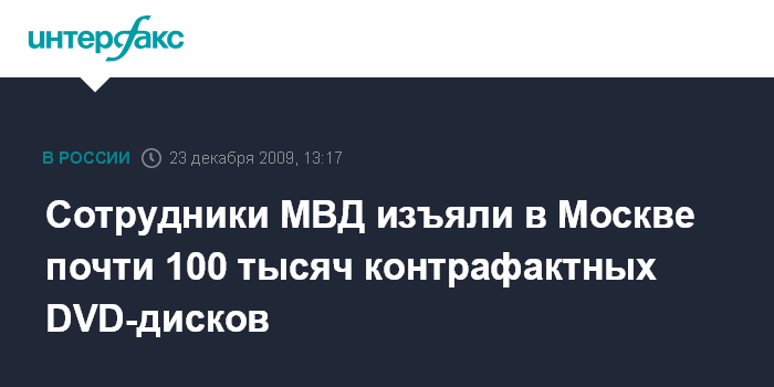 Москва. 23 декабря. INTERFAX.RU - Сотрудники департамента экономической безопасности (ДЭБ) МВД РФ ликвидировали в Москве два крупных склада контрафактных DVD-дисков, сообщили в пресс-службе ДЭБ. Они располагались в Центральном и Западном административном округах Москвы.