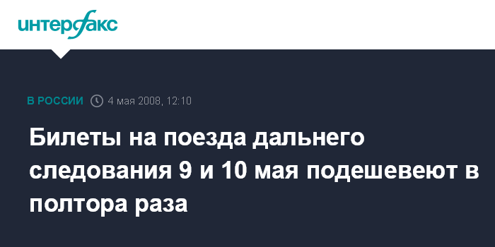 Москва. 4 мая. INTERFAX.RU - ОАО "Российские железные дороги" в соответствии с графиком гибкого тарифного регулирования 9 и 10 мая снизит стоимость билетов на поезда дальнего следования, сообщила пресс-служба компании.