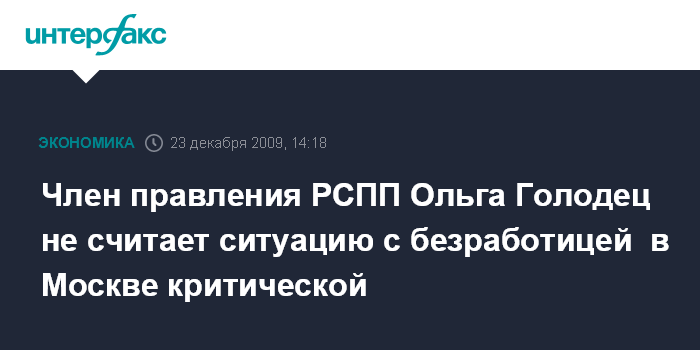 Москва. 23 декабря. INTERFAX.RU - Член правления РСПП, один из ведущих экспертов в области социальной политики Ольга Голодец сообщила, что "ситуация с безработицей в Москве не является критической". По данным эксперта, "число рабочих мест, которые предлагаются сегодня службами занятости, составляет около 50 000".