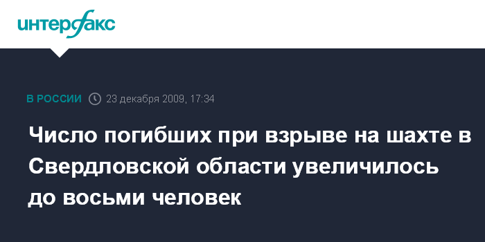 Москва. 23 декабря. INTERFAX.RU – По последним данным, при взрыве на шахте Естюнинская в Свердловской области погибли восемь человек, сообщили агентству "Интерфакс-Урал" в пресс-службе уральского регионального центра МЧС РФ.
