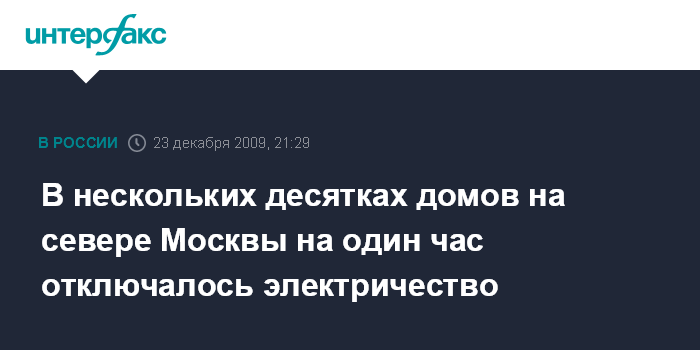Москва. 23 декабря. INTERFAX.RU – Отключение трех трансформаторов стало причиной временного прекращения энергоснабжения нескольких десятков домов в четырех районах Северного административного округа Москвы, сообщил "Интерфаксу" источник в городской администрации в среду.