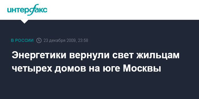 Москва. 23 декабря. ИНТЕРФАКС - Специалистам "Мосэнерго" удалось восстановить подачу электричества в четыре дома на проспекте Андропова (район станции метро "Коломенская") на юге Москвы, которые в среду вечером остались без света.