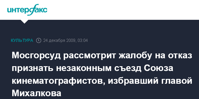 Москва. 24 декабря. ИНТЕРФАКС - Мосгорсуд в четверг рассмотрит кассационную жалобу на отказ признать незаконным мартовский съезд Союза кинематографистов России (СКР), на котором председателем организации был избран режиссер Никита Михалков.