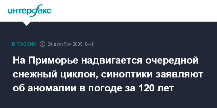 "За всю историю метеорологических наблюдений в городе Владивостоке, а это более 120 лет, подобного никогда не было. Даже четырех снегопадов до Нового года не было, не говоря уже о шести. На лицо явная аномалия", - сказал глава Приморгидромета.