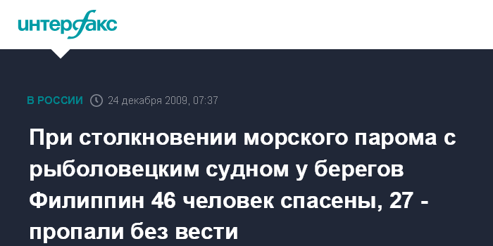 Манила. 24 декабря. ИНТЕРФАКС - Более двух десятков человек считаются пропавшими без вести после столкновения морского пассажирского парома с рыболовецким судном у берегов Филиппин в четверг, сообщает американская телевизионная корпорация Си-эн-эн.