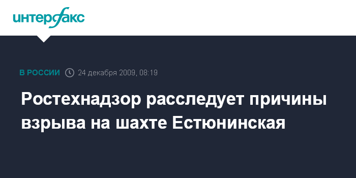 Москва. 23 декабря. INTERFAX.RU – Комиссия по расследованию взрыва на шахте Естюнинская ОАО "Высокогорский ГОК" (Нижний Тагил, Свердловская область, входит в Evraz Group) в Свердловской области, где в результате взрыва на шахте погибли девять человек, завершит работу 7 января.