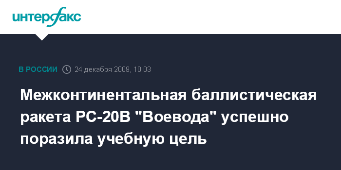 Москва. 23 декабря. INTERFAX.RU – Ракетные войска стратегического назначения в четверг осуществили успешный учебно-боевой пуск межконтинентальной баллистической ракеты РС-20В "Воевода, сообщил "Интерфаксу-АВН" пресс-секретарь управления пресс-службы и информации Минобороны РФ по РВСН полковник Вадим Коваль.
