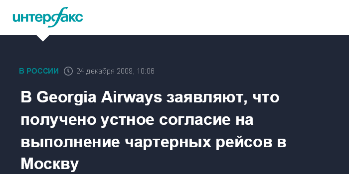 Москва. 23 декабря. INTERFAX.RU – Грузинская авиакомпания Airzena- Georgia Airways получила устное согласие российской стороны на осуществление чартерных рейсов по маршруту Тбилиси-Москва в рождественские и новогодние дни, сообщила "Интерфаксу" руководитель пресс-службы компании Нино Гиоргобиани.