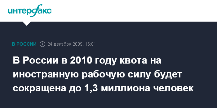 Москва. 24 декабря. INTERFAX.RU - Квота на иностранную рабочую силу в России в 2010 году будет сокращена до 1 млн 300 тыс. человек, сообщил глава ФНПР Михаил Шмаков после встречи с премьер-министром РФ Владимиром Путиным.