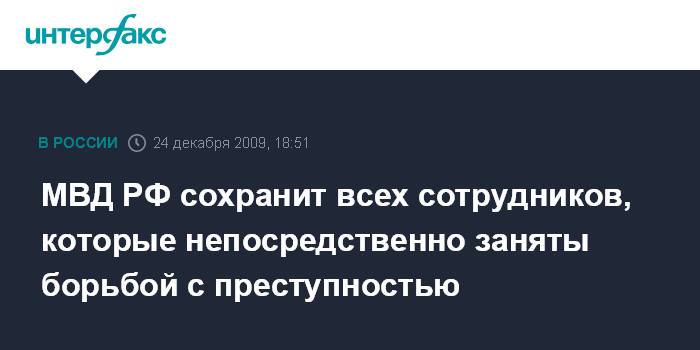 Москва. 24 декабря. INTERFAX.RU - Реформа министерства внутренних дел не повлечет за собой сокращения сотрудников и подразделений, которые непосредственно занимаются борьбой с преступностью. "Ни подразделения МВД, ни сотрудники, которые задействованы в борьбе с преступностью, сокращаться не будут", - заявил "Интерфаксу" в четверг источник в МВД, комментируя указ президента "О мерах по совершенствованию деятельности органов внутренних дел РФ".