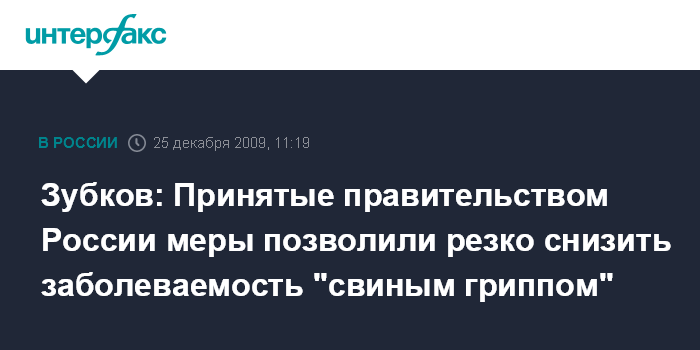 Москва. 25 декабря. INTERFAX.RU – Первый вице-премьер Виктор Зубков заявил, что заболеваемость вирусом гриппа A/H1N1 в России резко пошла на убыль.