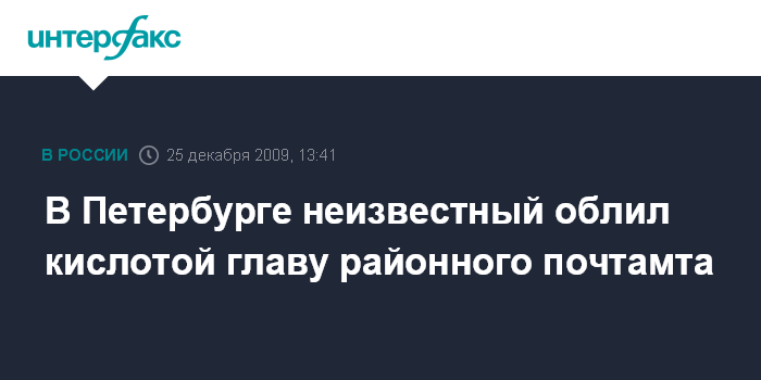 Москва. 25 декабря. INTERFAX.RU - В Петербурге неизвестный облил кислотой начальника Красносельского межрайонного почтамта.