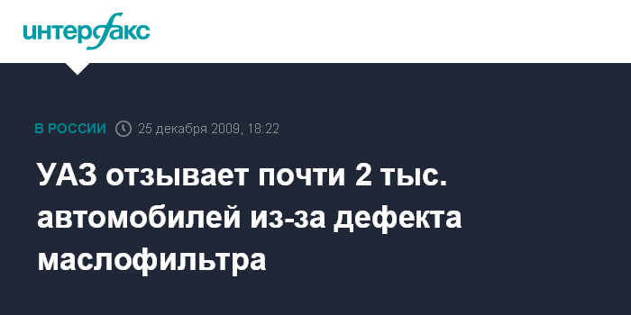 Москва. 25 декабря. INTERFAX.RU - ОАО "Ульяновский автомобильный завод" (УАЗ) объявляет об отзыве автомобилей УАЗ, проданных в период с середины ноября по декабрь 2009 года, в связи с выявлением дефекта масляного фильтра, сообщила "Интерфаксу" пресс-секретарь ОАО "УАЗ" Алла Акимова. "Под отзыв попадает 1 тыс. 870 автомобилей, оснащенных бензиновым двигателем сборки Заволжского моторного завода (РТС: ZMZN) (ЗМЗ - ИФ), в которых был обнаружен дефект масляного фильтра. Вследствие отказа масляного фильтра происходит падение давления масла в двигателе", - пояснила Акимова, добавив, что ЗМЗ, в свою очередь, получил эти фильтры с другого предприятия. По ее словам, все владельцы УАЗов, купившие автомобили с бензиновым двигателем в ноябре и декабре, могут обратиться в ближайший авторизированный сервисный центр УАЗ для проведения бесплатной замены масляного фильтра.