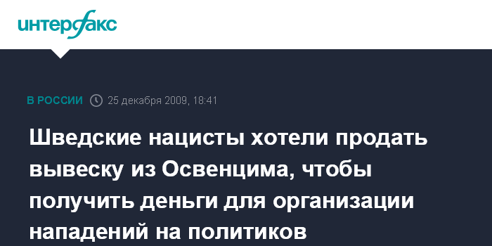 Москва. 25 декабря. INTERFAX.RU - Нацисты из Швеции планировали продать вывеску "Труд освобождает" с ворот бывшего концлагеря в Освенциме, чтобы получить деньги, необходимые для организации нападений на шведское руководство, сообщает британская газета "Таймс". "Мы получили сообщения о предполагаемых планах нападений, - заявил представитель шведской полиции Патрик Петер. - Мы предприняли некоторые действия. Мы воспринимаем все это серьезно".
