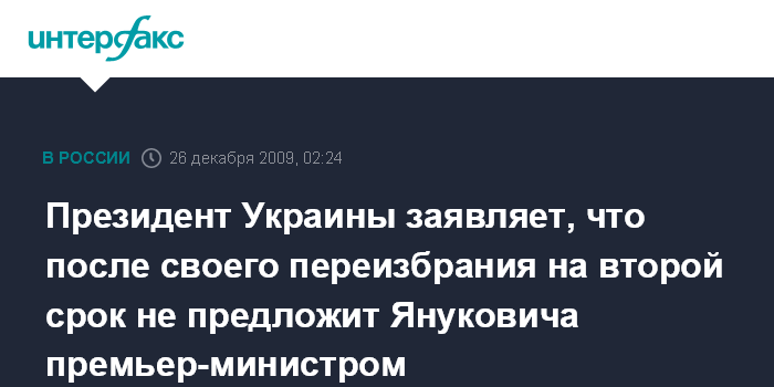 Киев. 26 декабря. ИНТЕРФАКС-УКРАИНА - Президент Украины Виктор Ющенко заявляет, что после переизбрания на второй срок не предложит лидера Партии регионов Виктора Януковича на пост премьер-министра.