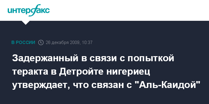 Согласно сообщению, задержанный гражданин Нигерии заявил о том, что действовал по указанию террористической сети "Аль-Каида". Как сообщалось ранее, пассажир, который пытался запустить фейерверк на борту самолета, совершавшего рейс из Амстердама (Голландия) в Детройт (США), на самом деле планировал его взорвать.