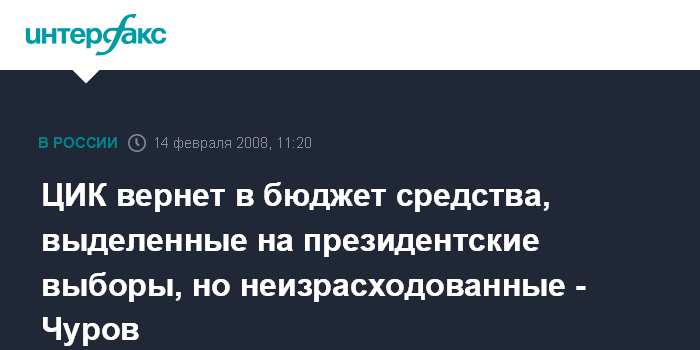 Москва. 14 февраля. INTERFAX.RU - Остаток финансовых средств, выделенных на проведение президентской избирательной кампании и выборов президента, будет возвращен в бюджет, заявил председатель Центризбиркома Владимир Чуров.