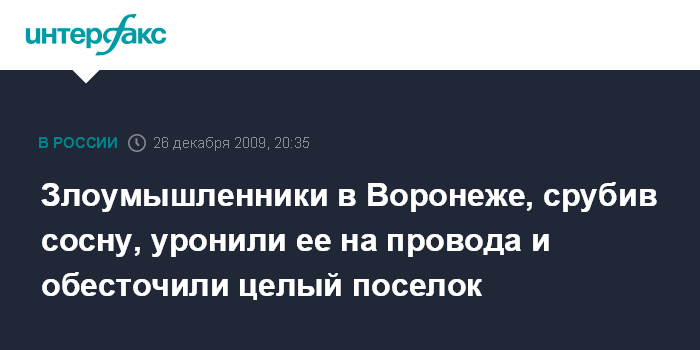 Воронеж. 26 декабря. ИНТЕРФАКС-ЦЕНТР - В пригороде Воронежа из-за нелегально срубленной сосны обесточен поселок Сомово, сообщили "Интерфаксу" в субботу в филиале ОАО "МРСК Центра" - "Воронежэнерго".