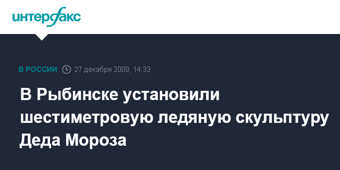 Ярославль. 27 декабря. INTERFAX.RU - Шестиметровую ледяную скульптуру Деда Мороза установили у ДК "Авиатор" в Рыбинске Ярославской области, сообщила "Интерфаксу" начальник управления культуры администрации Рыбинска Наталья Шульгина. По ее словам, это не единственная снежная скульптура, установленная в предпраздничные дни в Рыбинске. В парке на улице Димитрова воздвигнуты ледяные фигуры Старика и Старухи из сказки А.С.Пушкина "О рыбаке и рыбке".