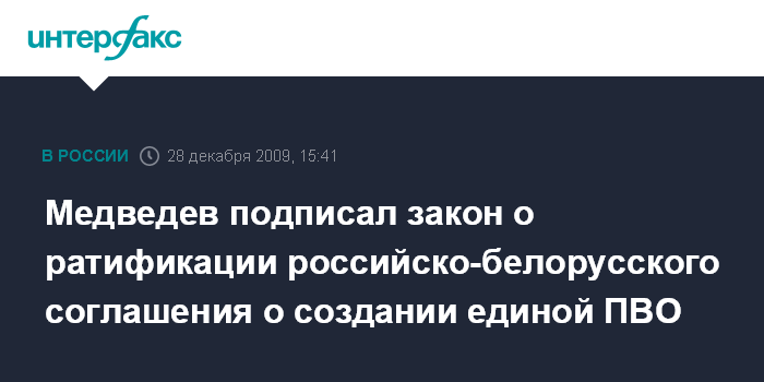 Москва. 28 декабря. INTERFAX.RU - Президент РФ Дмитрий Медведев подписал Федеральный закон "О ратификации Соглашения между Российской Федерацией и Республикой Беларусь о совместной охране внешней границы Союзного государства в воздушном пространстве и создании Единой региональной системы противовоздушной обороны Российской Федерации и Республики Беларусь", сообщает пресс-служба главы государства в понедельник.