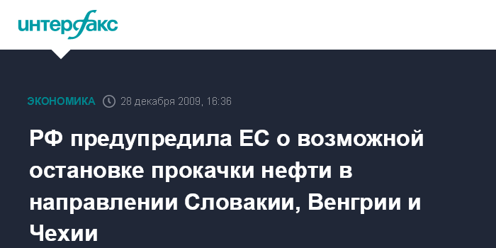 Москва. 28 декабря. INTERFAX.RU – Россия предупредила Европейский союз о возможной остановке прокачки нефти в направлении Словакии, Венгрии и Чехии, сообщило агентство Bloomberg со ссылкой на сообщение правительства Словакии.