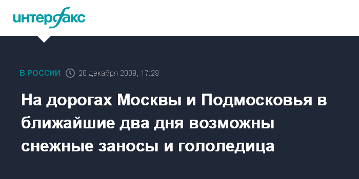 Москва. 28 декабря. INTERFAX.RU - Гидрометцентр РФ предупреждает о снежных заносах на московских дорогах во вторник и среду. "На дорогах снежные заносы, гололедица", - говорится в прогнозе, опубликованном на сайте Гидрометцентра. Такая ситуация ожидается на дорогах Москвы и области во вторник и среду.