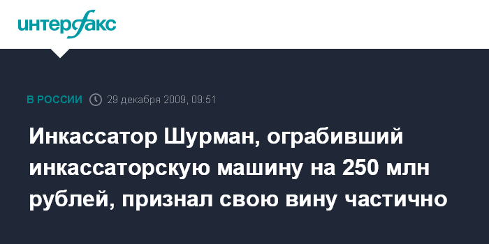 Москва. 29 декабря. INTERFAX.RU – Ленинский районный суд Перми на первом заседании по делу об ограблении инкассаторской машины огласил обвинения всем подсудимым - инкассатору Александру Шурману и трем его соучастникам.