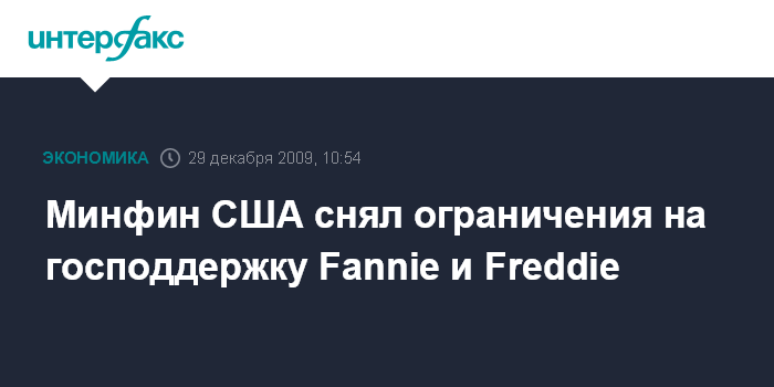 Вашингтон. 29 декабря. INTERFAX.RU - Министерство финансов США сняло ограничения на господдержку крупнейших ипотечных агентств страны Fannie Mae и Freddie Mac, сообщило агентство Bloomberg. В течение следующих трех лет американские власти будут предоставлять компаниям неограниченную помощь. Рынок выражал обеспокоенность, что выделенных ипотечным агентствам $400 млрд будет недостаточно, чтобы преодолеть последствия кризиса. Пока компании потратили из выделенных средств $111 млрд. Акции Fannie Mae подорожали благодаря этим сообщениям на 21% в понедельник, Freddie Mac - на 27%.