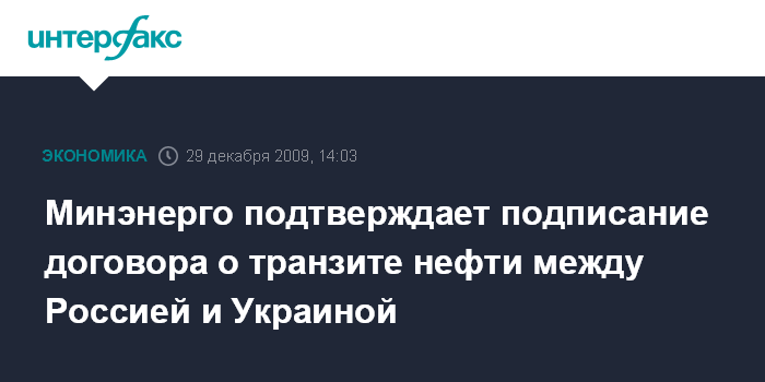 Москва. 29 декабря. INTERFAX.RU - Минэнерго РФ подтверждает подписание договора о транзите нефти между Россией и Украиной на 2010 год, сообщили Агентству нефтяной информации (АНИ) в Минэнерго РФ.
