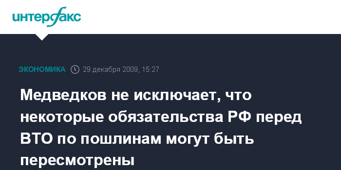 Москва. 29 декабря. INTERFAX.RU - Обязательства России по доступу на рынок товаров, которые уже согласованы в рамках переговоров по присоединению к ВТО, в целом меняться не будут, но возможны некоторые исключения, сообщил в интервью "Интерфаксу" глава российской делегации на переговорах по присоединению к ВТО, директор департамента торговых переговоров Минэкономразвития, руководитель единой переговорной группы Таможенного союза по присоединению к ВТО Максим Медведков. "Те российские обязательства, которые уже согласованы, меняться не будут. Исключением могут стать отдельные уровни тарифов, согласованные с членами ВТО, поскольку они могут быть скорректированы с учетом более либеральных ставок, согласованных Казахстаном", - сказал он. По его словам, речь идет, например, о пошлинах на автомобили, самолеты, некоторые сельхозтовары, некоторые химические товары.