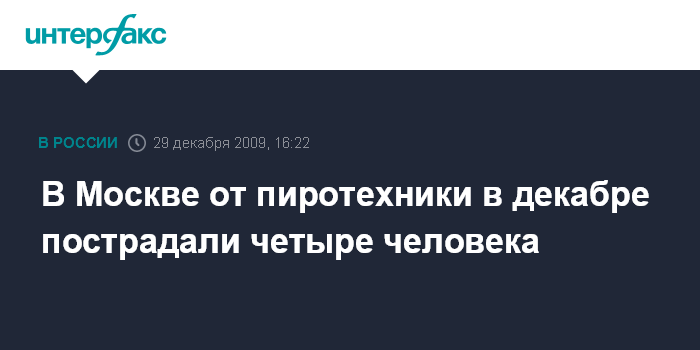 Москва. 29 декабря. INTERFAX.RU - В столице четыре человека получили травмы в результате нарушения правил использования пиротехники еще до наступления новогодних праздников, сообщил первый заместитель по государственной противопожарной службе начальника ГУ МЧС России по Москве Виктор Климкин на пресс-конференции во вторник. В целом же, отметил Климкин, из года в год число пострадавших от подобных ЧП неуклонно снижается. Так, в 2008 г. количество пострадавших с 31 декабря по 11 января составило 65 человек, включая 19 детей, в 2009 г. этот же показатель равнялся 35 пострадавшим, включая шестерых детей.