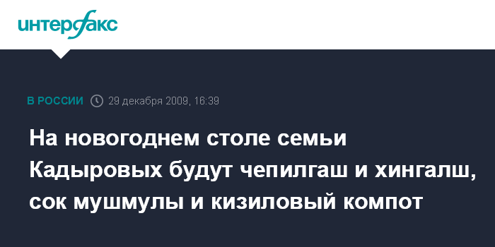 Среди традиционных блюд чеченской кухни, которые обязательно будут в новогоднем меню семьи Кадыровых, глава республики назвал "чепилгаш" (лепешки, заправленные творогом, которые пекут на сухой сковороде, обмывают горячей водой и смазывают топленым маслом) и "хингалш" (те же лепешки, только в качестве начинки используется пюре из вареной тыквы). Одно из любимых блюд Кадырова, как он рассказал, - галушки из кукурузной муки, которые подаются с отварным сушеным мясом и соусом.