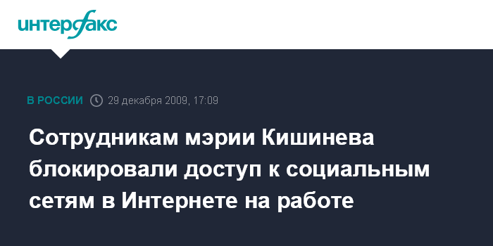 Москва. 29 декабря. INTERFAX.RU - Со вторника у сотрудников мэрии Кишинева на работе заблокирован доступ к социальным сетям в Интернете. Такое распоряжение издал накануне мэр Кишинева Дорин Киртоакэ. "Мы провели внутреннее расследование. Выяснилось, что каждый сотрудник мэрии проводит на сайтах "Одноклассники" и Facebook в среднем по два часа в день. Это ненормально. Недопустимо болтать в Интернете за счет рабочего времени", - сказал Киртоакэ.
