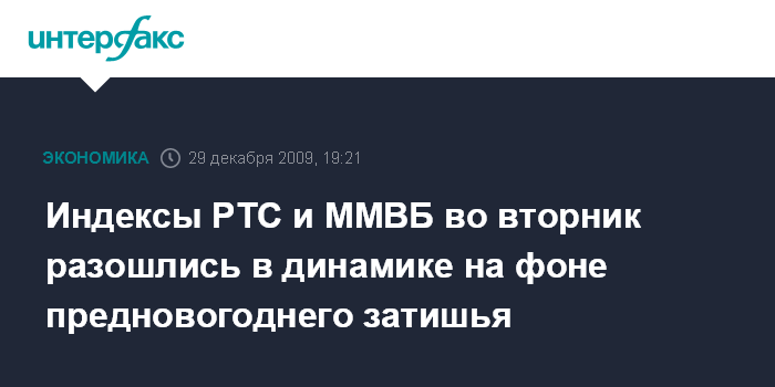 Москва. 29 декабря. ИНТЕРФАКС-АФИ - Рынок акций РФ во вторник показал разнополярную динамику цен бумаг и индексов на фоне предновогоднего затишья, статистика из США не смогла укрепить силы "быков".