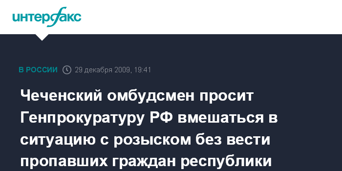 Чеченский омбудсмен просит Генпрокуратуру РФ вмешаться в ситуацию с розыском без вести пропавших граждан республики