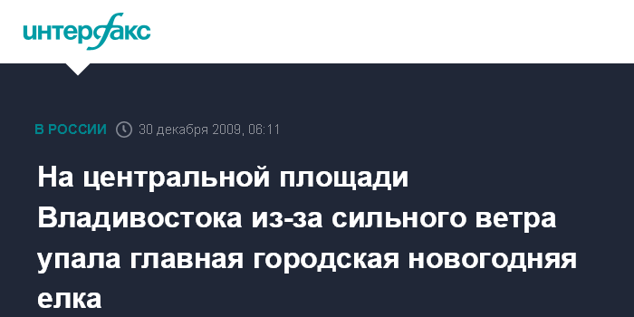 Владивосток. 30 декабря. ИНТЕРФАКС - ДАЛЬНИЙ ВОСТОК - Снегопад с сильным порывистым ветром, обрушившийся на Владивосток в среду, повалил главную новогоднюю елку на центральной площади города.