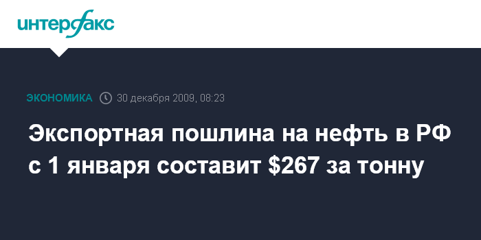 Москва. 30 декабря. ИНТЕРФАКС-АФИ - Экспортная пошлина на нефть в РФ с 1 января 2010 г. составит $267 за тонну. Соответствующее постановление, подписанное премьер-министром Владимиром Путиным 25 декабря, размещено на сайте правительства.