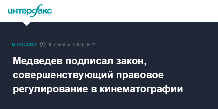 Москва. 30 декабря. ИНТЕРФАКС - Президент России Дмитрий Медведев подписал Федеральный закон "О внесении изменений в Федеральный закон "О государственной поддержке кинематографии Российской Федерации", сообщает в среду пресс-служба Кремля. Данный закон был принят Государственной Думой 23 декабря 2009 года и одобрен Советом Федерации 25 декабря 2009 года.