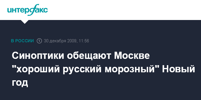 Москва. 30 декабря. INTERFAX.RU - В новогоднюю ночь в столичном регионе ожидается морозная погода, сообщил в среду журналистам гендиректор Гидрометеобюро Москвы и Московской области Алексей Ляхов. "Будет хороший русский морозный Новый год. Если сейчас в Москве 2-3 градуса мороза, то к вечеру начнется снижение температуры, и уже ночью температура опустится до минус 8-10 градусов", - уточнил он. По его данным, в новогоднюю ночь температура воздуха в Москве опустится до минус 14-15 градусов, а в первые дни 2010 года дневные температуры составят около минус 10 градусов, в дальнейшем в разное время суток возможно снижение до минус 17-19 градусов.