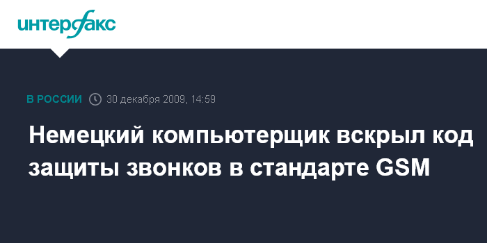 Москва. 30 декабря. INTERFAX.RU – Немецкий эксперт в области информатики Карстен Ноль опубликовал данные секретного кода, используемого для защиты разговоров более 4 млрд пользователей стандарта мобильной связи GSM, сообщила британская ВВС.