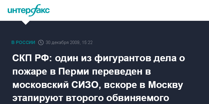 СКП РФ: один из фигурантов дела о пожаре в Перми переведен в московский СИЗО, вскоре в Москву этапируют второго обвиняемого