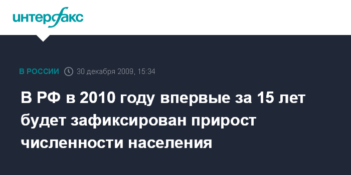 Москва. 30 декабря. INTERFAX.RU - В России в 2010 г. будет зафиксирован прирост численности населения впервые с 1995 г., заявил премьер-министр РФ Владимир Путин на заседании президиума правительства. "С большой долей уверенности можно сказать, что впервые с 1995 г. в России будет зафиксирован прирост численности населения, а ожидаемая продолжительность жизни достигнет 69 лет", - сказал он.
